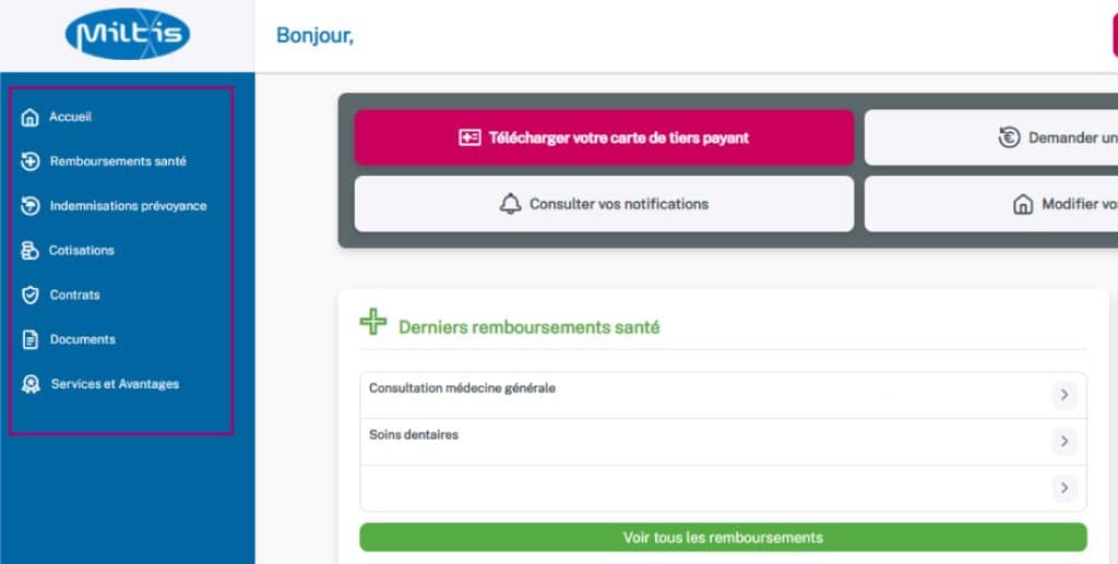 - Enfin, accédez à tous les services et avantages de votre contrat ainsi qu’aux dernières actualités santé de votre mutuelle MILTIS.