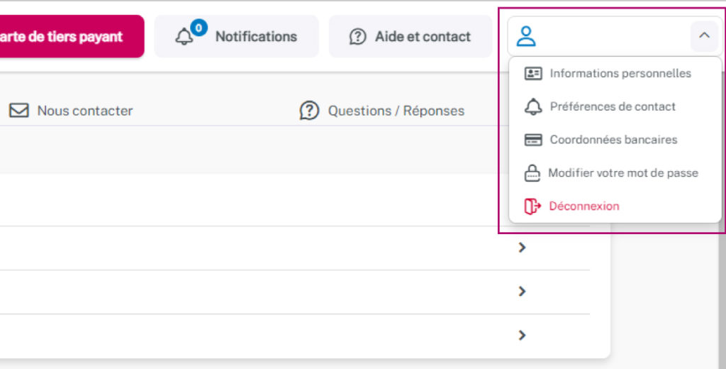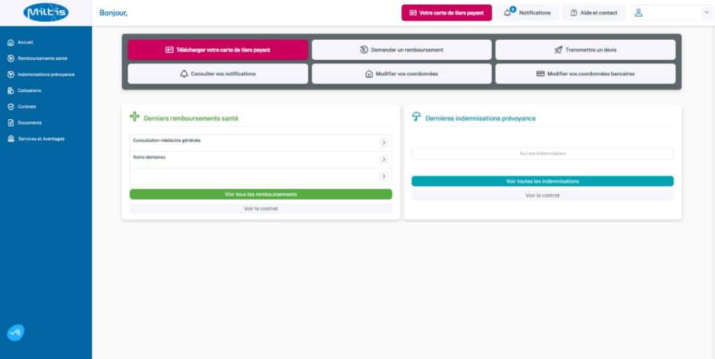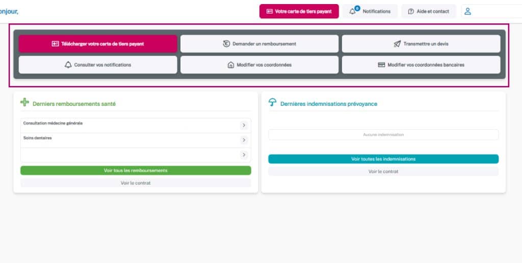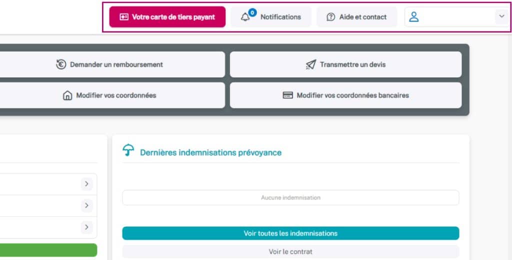 Le menu du haut est un raccourci pour accéder rapidement à votre carte de tiers payant, être alerté par notifications lorsque nous interagissons avec vous (réponse à une demande, envoi d’un courriel sur votre messagerie…).