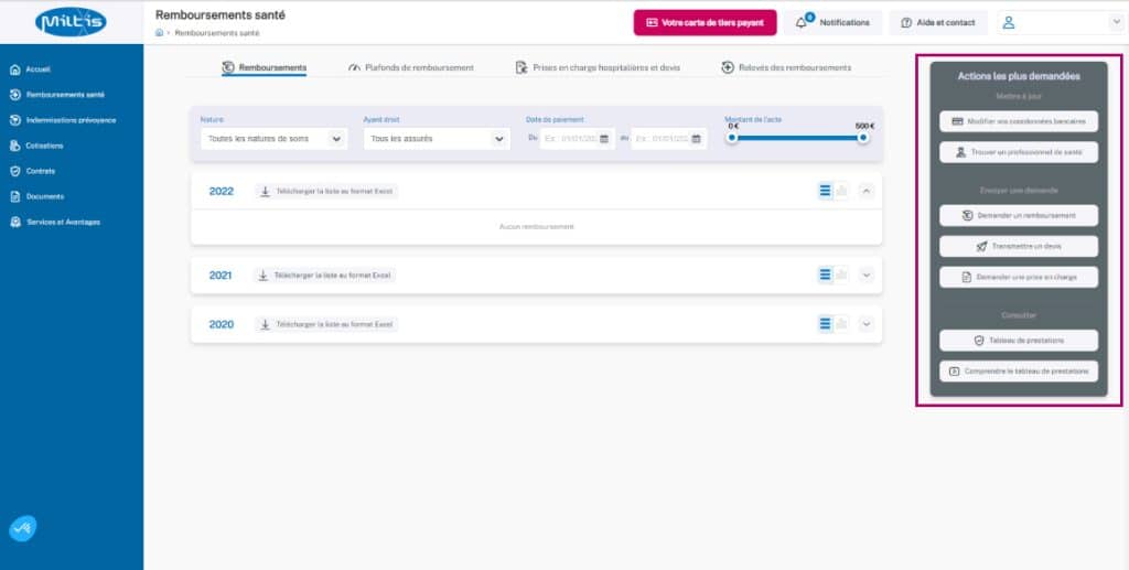 Pour finir, chaque rubrique contient un encadré gris à droite qui vous permet de réaliser rapidement différentes actions telles que : géolocaliser les professionnels de santé qui pratiquent le tiers payant, télécharger votre certificat d’adhésion, demander un remboursement ou encore transmettre un devis.